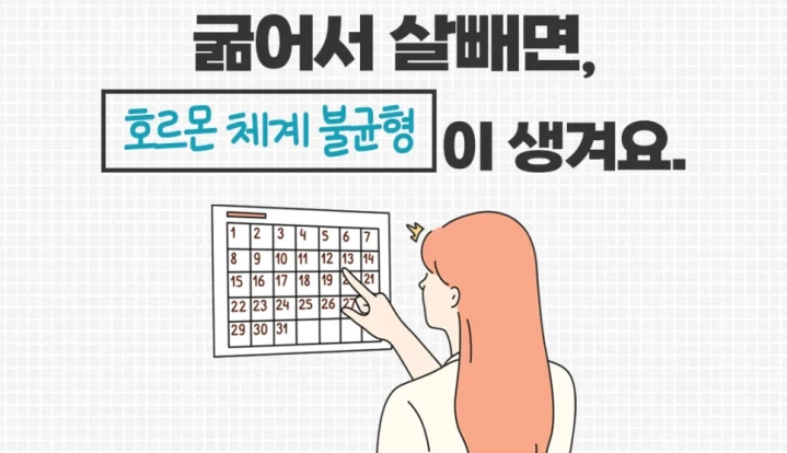 기초대사량을 올리는 방법 중 하나는 인체가 필요로 하는 탄수화물, 단백질, 지방, 칼슘, 비타민과 무기질 등 필수 영양소들을 고루 섭취하는거라고 하는데요. 반대로 쫄쫄 굶다보면 기초대사량은 당연히 떨어질 수 밖에 없죠. 그러면 자연스럽게 체력도 줄어들고 조금만 움직이거나 일을 해도 피로감이 쌓인다고 합니다. 쉽게 무기력감도 느낄 수 있고 면역력도 떨어지면서 다른 면역성 질환에도 노출될 수 있다고 합니다. 또한 뼈의 영양 불균형은 골다공증을 초래하고 이외에도 피부 탄력이 떨어져 주름이 생기게 되면서 피부손상이 발생하고 체내수분도 빠져나가기 때문에 노화 현상이 가속화된다고 하는데요. 한번 진행된 노화는 다시 되돌릴 수 없다는 사실 명심하세요.