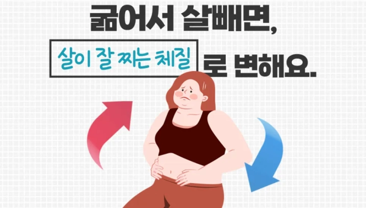 굶다보면 먹지 못한다는 스트레스가 생기면서 함께 코르티솔 이라는 호르몬이 분비된다고 하는데요. 이 호르몬은 식욕을 자극하는 호르몬으로 먹지 못한다는 스트레스가 쌓이면 오히려 식욕 조절이 더욱 어려워지고 그럴때 폭식을 하게 되면 비상 상태에 돌입해서 지방이나 근육을 에너지원으로 사용하던 몸이 기회를 놓치지 않고 최대한 많은 양의 영양소를 저장하려 한다고 합니다. 그래서 지방이나 탄수화물의 흡수 속도도 빨라지기 때문에 살들이 더욱 쉽게 불어나고 이전보다 살이 더 찌는 요요현상이 나타나게 되고 또한 살이 찌기 쉬운 체질로 바뀔 수도 있다고 합니다.