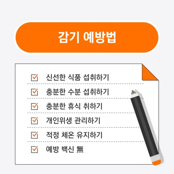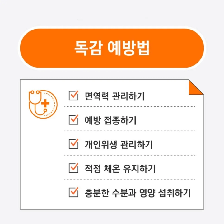 각종 세균이나 바이러스로부터 인체를 방어하는 역할을 하는 면역력은 건강관리에 있어 정말 중요하다고 할 수 있죠. 충분한 수면, 스트레스 해소, 적당한 운동, 균형 잡힌 식단의 영양 섭취 등으로 면역력을 관리해주는 것이 좋고 독감은 감기와는 달리 예방 백신이 있고 접종 시 70~90% 예방효과가 있으므로 독감 예방접종으로 독감을 예방하는 것이 좋다고 하는데요. 독감을 예방하기 위해서는 예방 접종 외에도 감기와 마찬가지로 개인위생 관리, 적정 체온 유지, 충분한 수분과 영양 섭취를 하는 것이 좋다고 합니다.